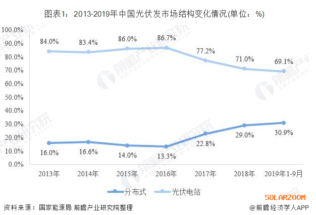 不同于光伏電站,分布式光伏發(fā)電是指在用戶所在場(chǎng)地或附近建設(shè)運(yùn)行,以用戶側(cè)自發(fā)自用為主、多余電量上網(wǎng)且在配電網(wǎng)系統(tǒng)平衡調(diào)節(jié)為特征的光伏發(fā)電設(shè)施。近年來,國(guó)家對(duì)分布式光伏發(fā)電系統(tǒng)一直采取積極鼓勵(lì)的態(tài)度,并出臺(tái)了一系列扶持措施。2016年底出臺(tái)的《電力發(fā)展“十三五”規(guī)劃》對(duì)分布式光伏設(shè)定了超常規(guī)發(fā)展目標(biāo):“2020年,太陽能發(fā)電裝機(jī)達(dá)到1.1億千瓦以上,分布式光伏6000萬千瓦以上”。隨著各地分布式光伏發(fā)電建設(shè)的推進(jìn)。我國(guó)光伏發(fā)電市場(chǎng)結(jié)構(gòu)發(fā)生改變,尤其是2016年以來,我國(guó)分布式光伏市場(chǎng)份額已經(jīng)由13.3%提升至30.9%。