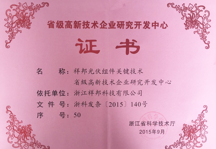 祥邦光伏組件關(guān)鍵技術(shù)省級(jí)高新技術(shù)企業(yè)研究開(kāi)發(fā)中心
